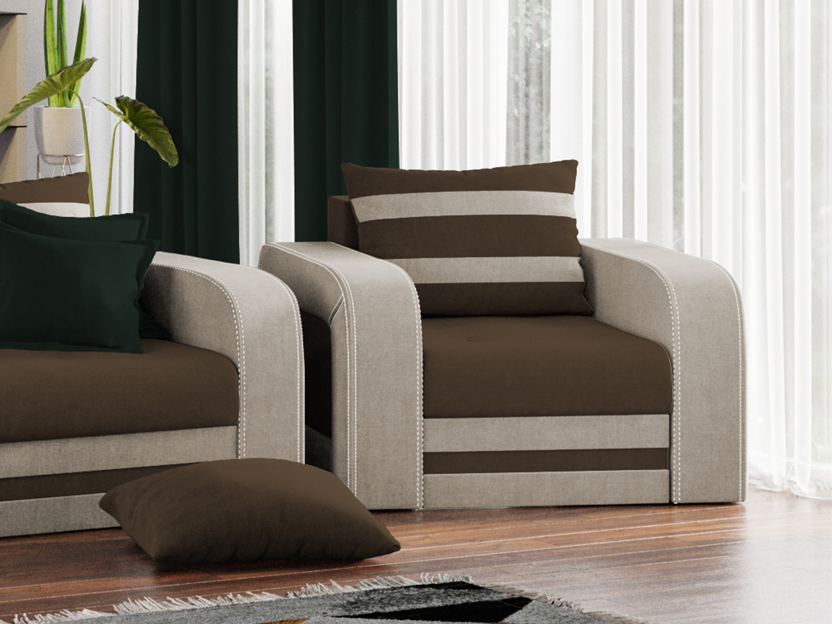 Fotoliu Camila Maro / CremFotoliu Camila Maro / Crem este piesa de mobilier ce va completa cu siguranta casa voastra, oferindu-va spatiul necesar indiferent de situatie. Formele rotunjite ale manerelor si al sezutului adauga un plus de confort acestui fotoliu. Butonii de pe sezut dau un plus de eleganta si stil oricarui living. Te poti aseza astfel incat sa te simti bine si relaxat timp de multe ore, gratie pernei detasabile pentru spatar, care ofera sustinere corpului tau exact in pozitia dorita. Are dimensiunea de: 97 cm lungime, 90 cm latime, 80 cm inaltime totala. Este tapitat cu stofa de calitate pe diverse culori.Atentie: Pretul afisat nu include alte accesorii sau obiecte de decor (pernele deco, tablouri, elemente de iluminat, covor etc.). Taburetele se pot achizitiona optional. Livrare gratuita si rapida, 4-10 zile lucratoare prin flota proprie Suntem producatori de tapiterii, fara intermediari, Toate piesele de tapiterii au o garantie de 2 aniOfera fermitatea optima, dar si confortul dorit prin sezutul fotoliului care este pe relaxa (arcuri elicoidale și poliuretan). Scheletul este rezistent, realizat pe structura solida de fag si pal.Fotoliu Camila Maro / Crem se incadreaza cu usurinta in majoritatea locuintelor indiferent de stilul acestora. Puteti alege din mai multe culori pentru stofa. Produsele disponibile le puteti vedea aici Modele Camila. Dimensiuni Fotoliu Camila Latime: 97 cm Adancime: 90 cm Inaltime: 80 cm Latime intre brate:60 cm Adancime sezut: 80 cm Inaltime sezut: 47 cm Inaltime perna: 50 cm Grosime brate: 17 cm Tapiterie Fotoliu Camila Maro / CremTapiteria produsului este din stofa Maro si Crem. Nuantele acestui produs nu sunt pretentioase, mascheaza eventualele evenimente neplacute prin care se pot murdari sau pata si se integreaza perfect in majoritatea locuintelor.Intretinere: se recomanda ca praful sa se stearga cu un material textil moale (finet) umed si sa nu se curete cu agenti chimici (diluant, acetona). Imaginile sunt cu titlu de prezentare si pot avea mici diferente de nuante in functie de display. Dimensiunile sunt exprimate în centimetri și pot oscila între ± 50 mm.