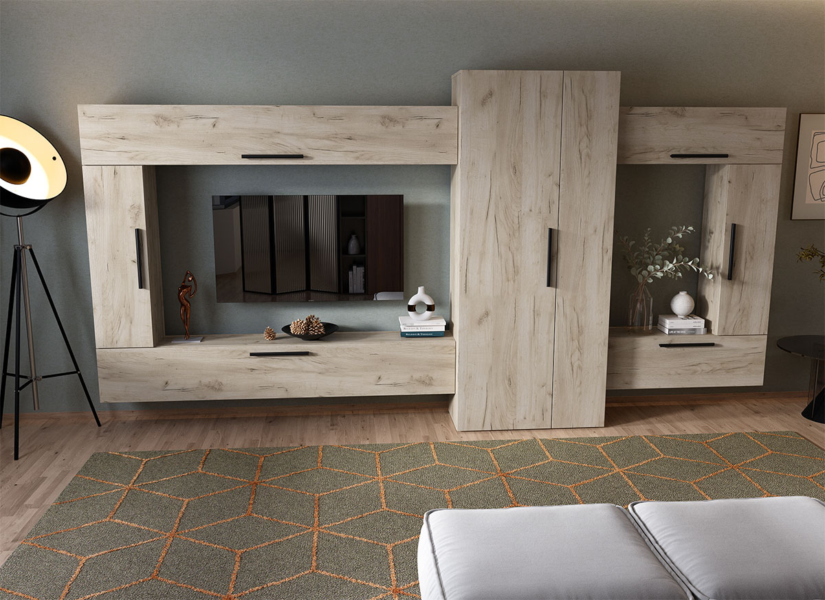 Living Pati 007 – Mobila Sufragerie Stejar Living Pati 007 – Mobila Sufragerie Stejar face parte dintr-o categorie de mobilier modern, contemporan ce imbina designul cu utilitatea. Familia de living Pati are 4 decoruri: stejar, alb, gri si beton . Am realizat peste 100 de configuratii din care puteti alege cu dimensiuni si stiluri diferite. Livrare gratuita si rapida, 4-10 zile lucratoare prin flota proprie Suntem producatori de mobilier, fara intermediari Toate piesele de mobilier au o garantie de 2 ani Corpurile sunt construite din PAL melaminat de 16mm. Cantul aplicat este de 0,6 ce le permite muchiilor sa fie placute la atingere . Video de prezentare familie Videoul de prezentare poate contine mai multe corpuri de mobilier sau mai putine in comparatie cu produsul de pe aceasta pagina. Scopul acestui video este de a detalia aspectul materialelor, accesoriilor cat si a familiei din care face parte. Dimensiuni Living Pati 007 – Mobila Sufragerie Stejar Imaginea alaturata prezinta compartimentarea pentru mobila de sufragerie Pati. Aceasta configuratie contine urmatoarele corpuri: 4 x Corp 920: L 92 x H 29 x A 26.7 cm 2 x Corp 1850: L 185 x H 29 x A 26.7 cm Dulap: L 79.8 x H 185 x A 35 cm Dimensiuni totale living Pati L 356.8 x A 35 x H 185 cm Spatiul de TV: diagonala maxima 139 cm. Toate corpurile se pot pune pe stanga sau pe dreapta in functie de cum doriti. Nu este obligatoriu pozitionarea ca in prezentare. Ele nu sunt prinse unul de celalalt, sunt independente. SCHITA MONTAJ corp 920 inferior SCHITA MONTAJ corp 920 superior SCHITA MONTAJ corp 920 vertical SCHITA MONTAJ corp 1850 superior SCHITA MONTAJ corp 1850 inferior SCHITA MONTAJ dulap 2U Pati Pretul afisat nu include alte accesorii sau obiecte de decor (TV, tablouri, elemente de iluminat, covor etc.) Dimensiunile sunt exprimate in cm si pot oscila intre ± 10 mm. Produsul se livreaza demontat si este insotit de accesorii si instructiuni de asamblare.
