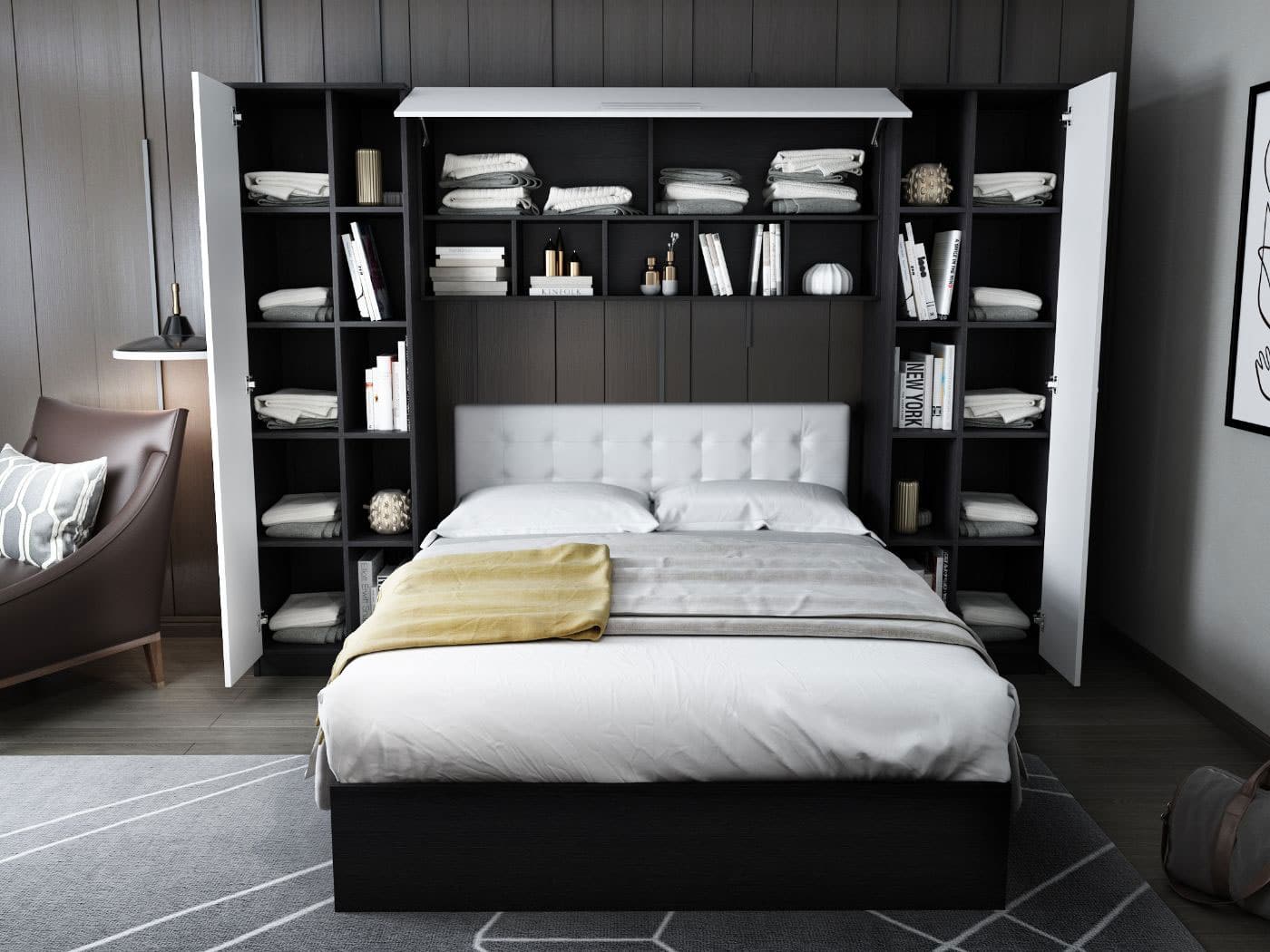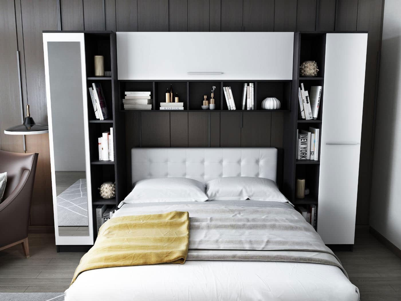 Dormitor Mario 2.87m pat incadrat si oglinda tapitat alb Un set de dormitor ce economiseste spatiu, atat pentru camere mici cat si pentru camere mari ce nu vor sa ocupe peretii cu mobilier. Include pat, corp suprapozabil suspendat deasupra patului si dulapuri laterale . Dimensiunea peretelui pe care se pozitioneaza dormitorul trebuie sa fie de minim 2.87m . Dormitorul este compus din: 2 x Dulap 1U + polite – L 66.6 x A 48 x H 192cm – Schita Montaj Corp Suprapozabil – L 154 x A 30.4 x H 69 cm – Schita Montaj Compartimentate cu 12 polite inchise, 15 deschise